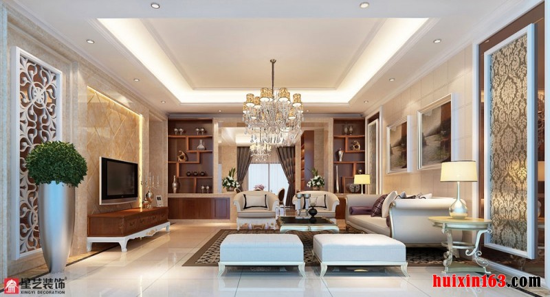 注重对称的空间美感是欧式风格的特征之一,因此在本案设计中,不难发现这一特征,对称式的沙发背景墙,石膏线框让背景墙更显立体,中间浅米色格子墙纸铺贴,大小合适的装饰画点缀,两侧茶色镜搭配经典欧式花纹墙纸,整体设计简约大气且格调高雅。凹位造型吊顶设计,大气且具有层次感,华美的水晶灯悬挂于吊顶中央,恰当好处,画龙点睛。灯带及射灯的运用,不仅增加了吊顶的美感也增加了室内亮度,让家居更显明亮。大理石电视背景墙设计,花纹墙砖铺贴,茶色镜搭配白色木镂空花格装饰,设计简洁明快却不失高贵典雅气质,摒弃了暴发户般的俗不可耐,却依旧可以营造出奢华高贵的感觉。浅色地板砖铺地,深色花纹地毯过渡,将客厅中的核心区域划定了出来,造型优雅的茶几,时尚亮丽,浅色简约欧式沙发,浅金色结构框架,散发着低调的华贵之感,优美的造型,精心的修饰,完美的轮廓,尽显端庄雅致。